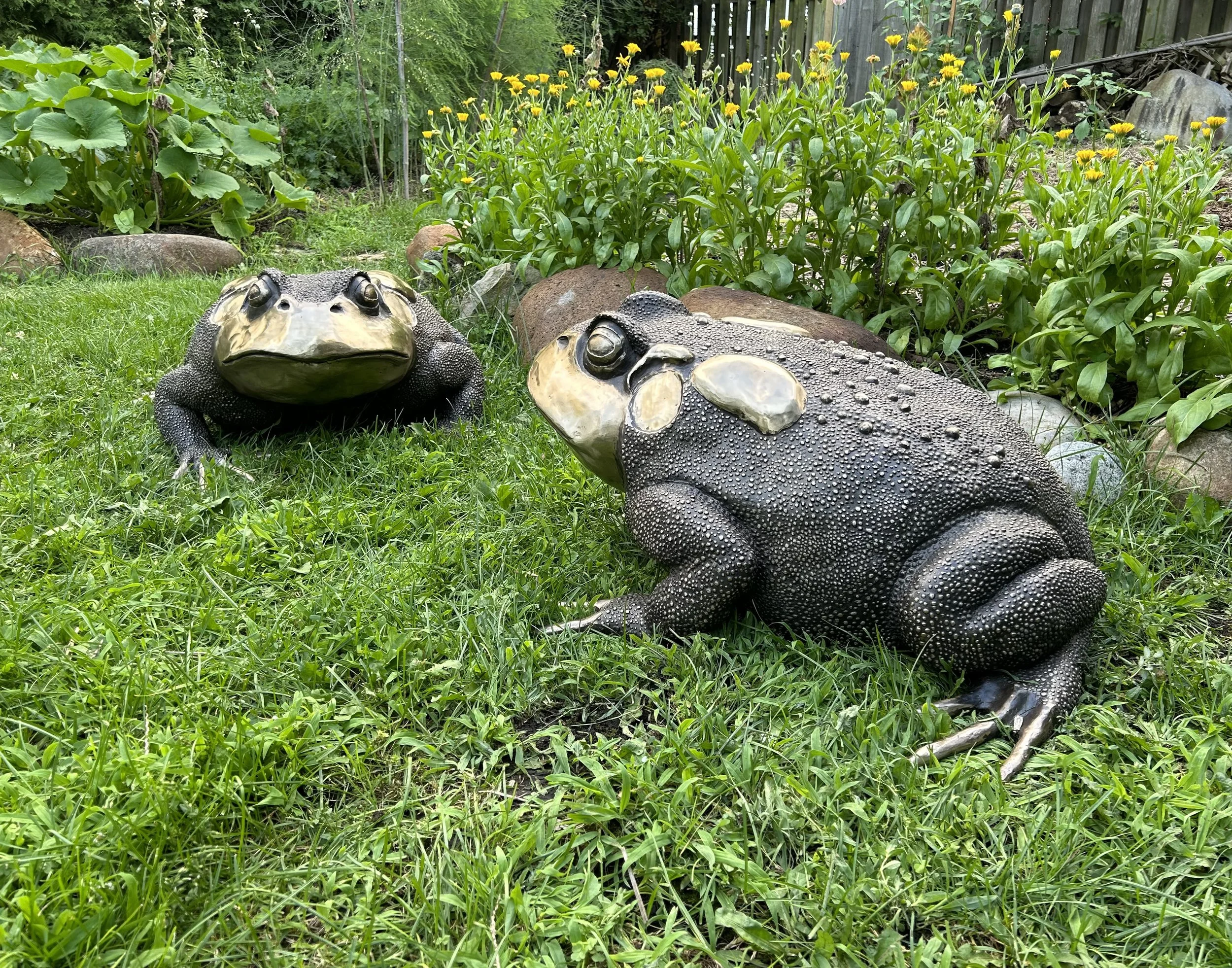 Toad Touch is a pair of human sized bronze toads that celebrate a special moment in the toad’s life cycle—when toads return to land after laying their eggs in water. The artist created them as a way of showing how toads and humans share space and shape each other’s lives.